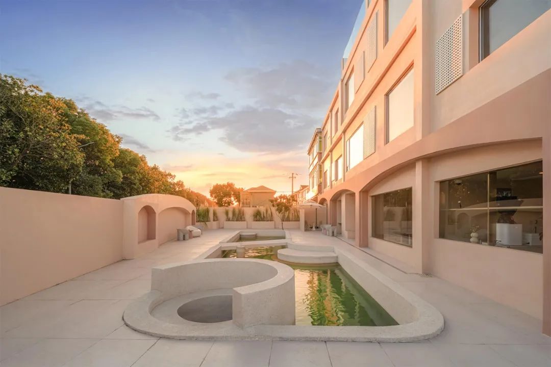 棲夢·花溪整體呈現為粉色,使用冷靜的中性灰作為調和,精心調配的色塊比例加以金色材質作為點綴。同時,硬裝材料的選擇也以堅硬感的材質為主,置入玻璃、金屬、亞克力,輔以穿孔板、水磨石和微水泥等,再用布藝軟裝作為輔助,形成細膩剛硬的有機搭配。堅硬的材質下,溫柔無處不在。不僅構建出如夢似幻的建筑空間,還展現出剛柔并濟的特質。