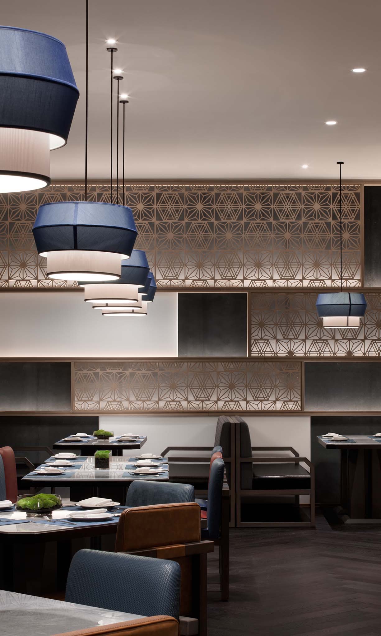 全日餐廳延續法式風情,墨綠、深灰、暖橙圖案交錯,與大堂共譜整體韻律感。細密線性格柵,創意序列燈具,營造強烈秩序感。大堂酒廊是賓客休憩和社交的好去處,啟幕云端流動盛宴。