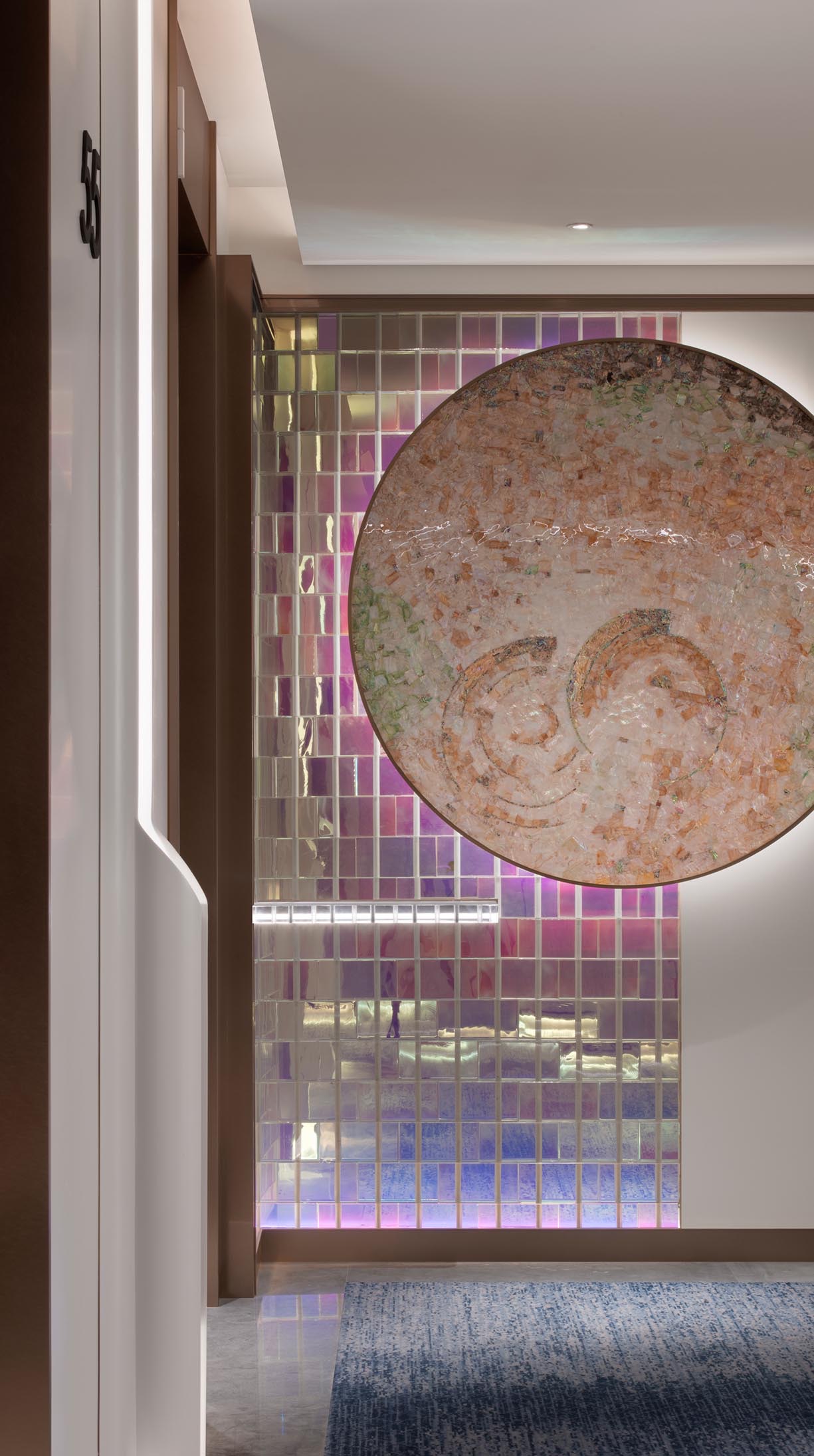 炫彩玻璃藝術墻,悄然呼應大堂裝飾。燈光照射在玻璃上,折射出淡淡的粉紫色,淡得難以察覺,溫柔雅致,讓人頓時有了分外的舒適感。