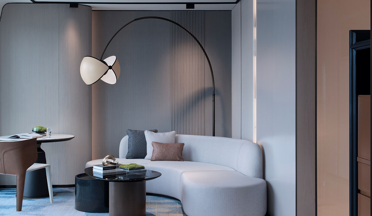 客房現代簡約的風格,弧形的天花板、清雅的色調與有機線條的家具創造出溫柔的包裹感,隱喻豪華車廂及鉑爾曼的品牌起源,給賓客帶來靜謐溫馨的感受。