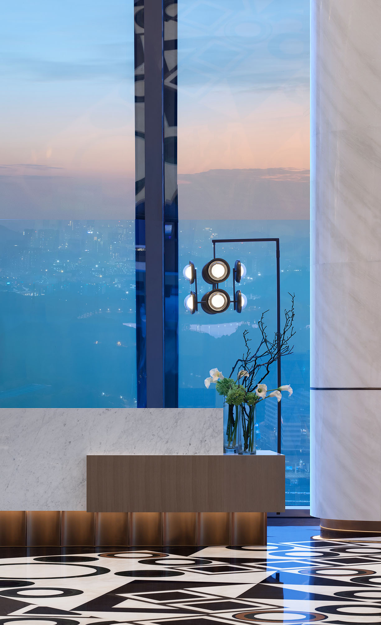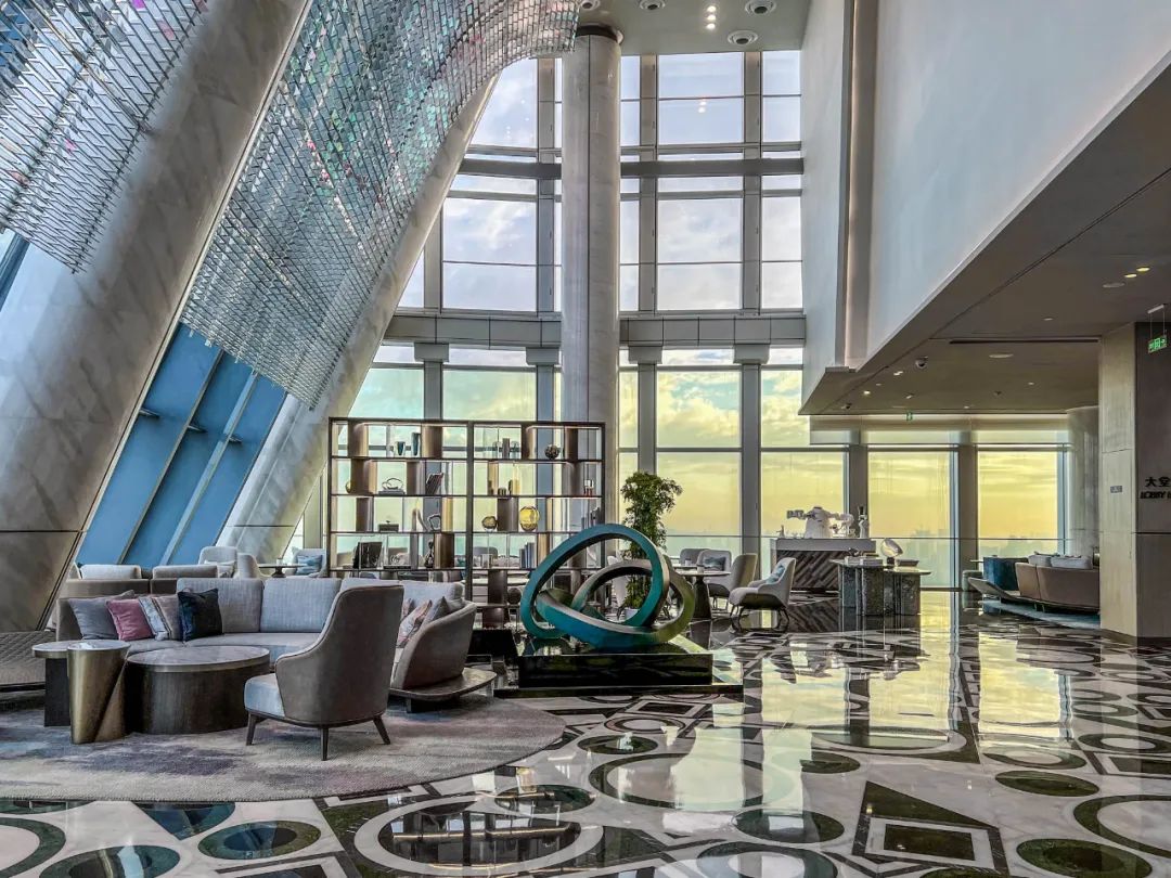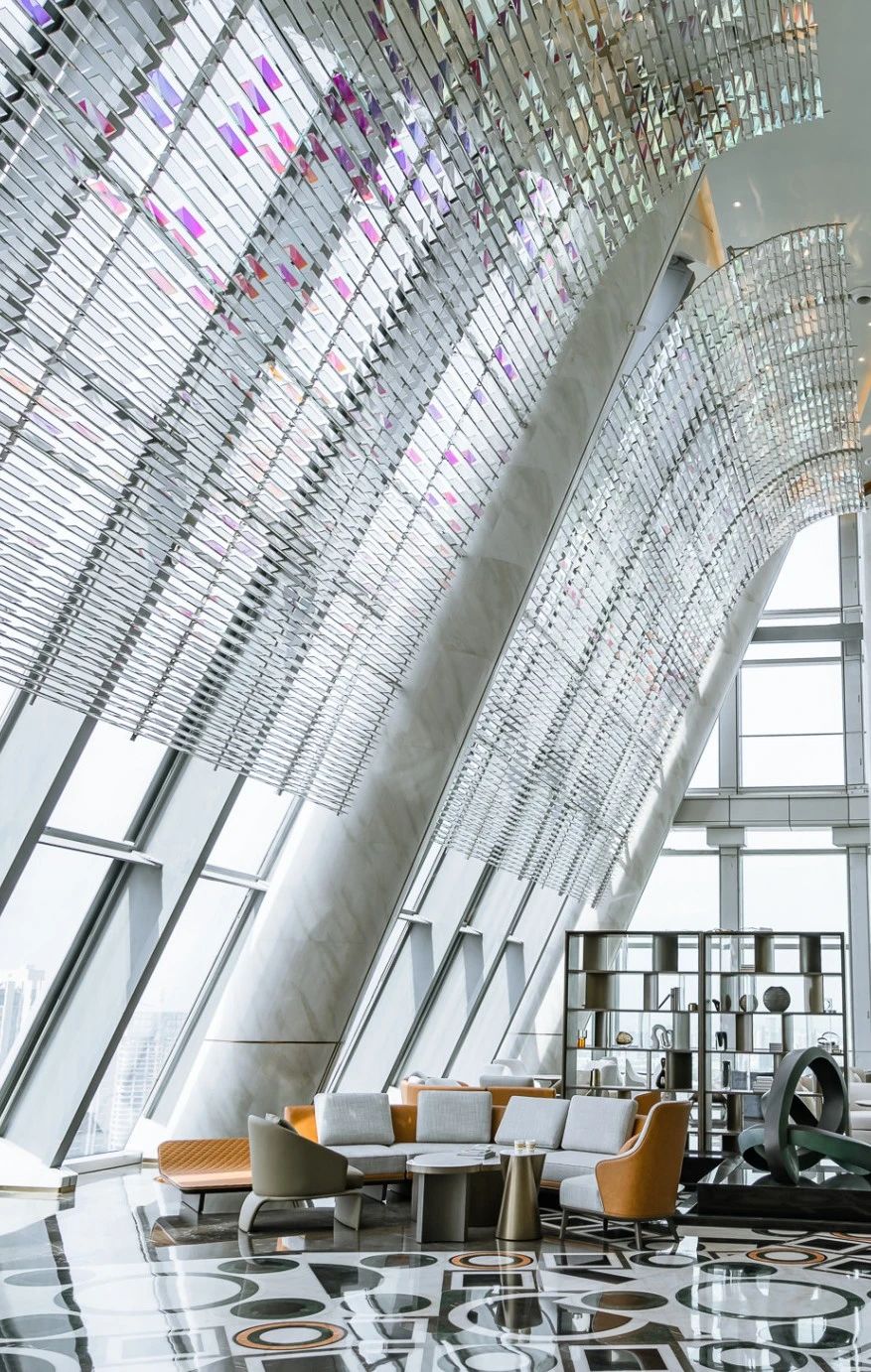 乘坐高速電梯,登上位于46層的酒店空中大堂,可以獨享258米高空之上360度的全景視角。步入了這座云端酒店,大堂的頂部均布置了雅白的立體折面天花,全景觀空中大堂在設計上大量運用線性元素,營造出獨具幾何美學的視覺空間。