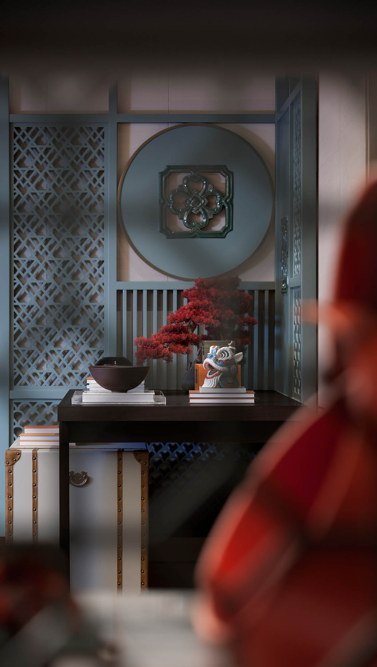薄藍格珊、蔥綠陶瓷滿州窗,與古典棗紅墻面,演繹當代廣府特色。